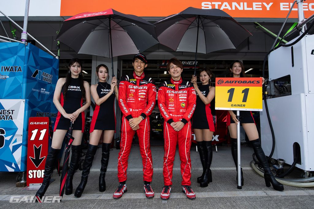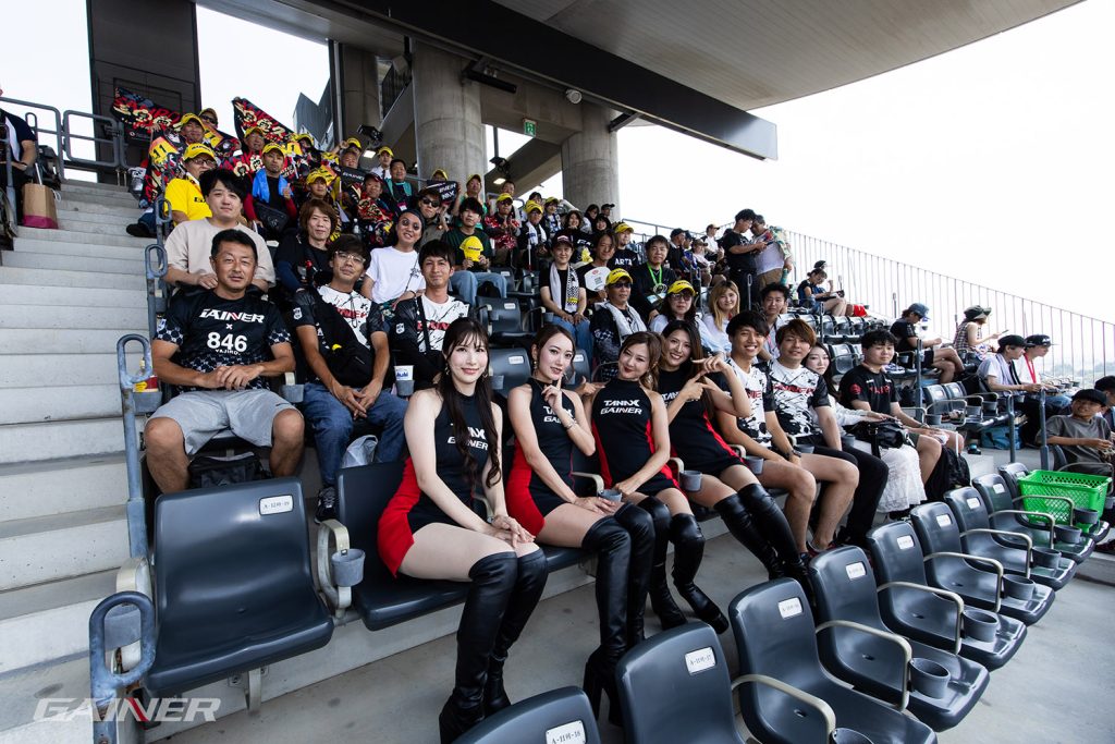 毎年鈴鹿サーキットではGAINERサポーターシートを設置し、決勝日は11時15分から2名のドライバー、4名のレースアンバサダーで決勝前のV2シートまでご挨拶に伺い、決勝での力走を誓った。今回のタイムスケジュールが通常よりも遅く、決勝スタートは15時30分。昨日よりも湿度が高く、風もそれほど吹いていない為、かなりの蒸し暑さの中でウォームアップ走行がオンタイムで開始された。走り出しは大木から。タイムを見ても上位のタイムで周回を重ね富田と交代。しかし急にエンジンが吹けなくなり1周計測でピットへ。センサートラブルのようで、メカニックが迅速に対応しグリッドへの試走は問題なくピットを離れる事が出来た。